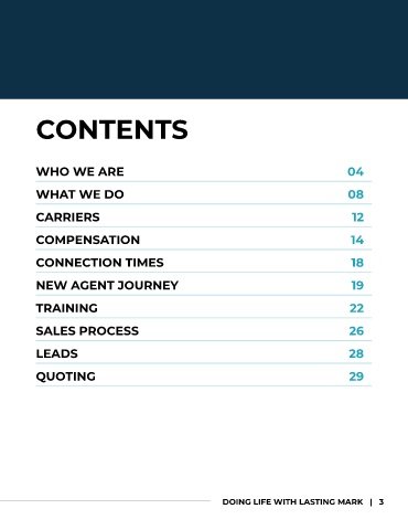 CONTENTS WHO WE ARE 04 WHAT WE DO 08 CARRIERS 12 COMPENSATION 14 CONNECTION TIMES 18 NEW AGENT JOURNEY 19 TRAINING 22 SALES PROCESS 26 LEADS 28 QUOTING 29 DOING LIFE WITH LASTING MARK | 3